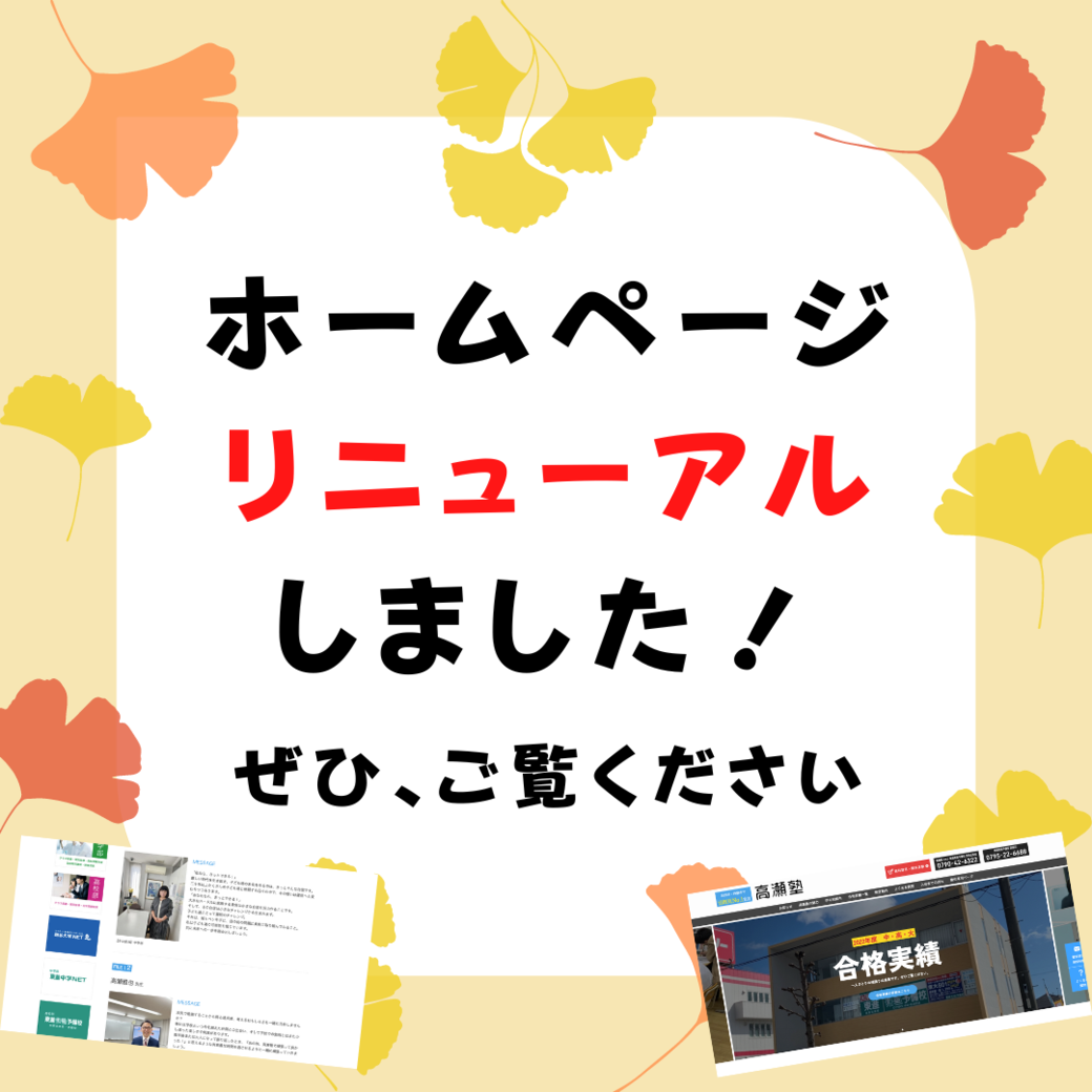 ホームページをリニューアルしました! 2022 9/24 お知らせ 2022年9月22日2022年9月24日 ホームページをリニューアルしました! 各学年の説明や講師紹介も更新しています😆 ぜひご覧ください! お知らせ URLをコピーしました! 10月は高瀬塾を2週間たっぷり無料体験! 関連するお知らせ 3月1日(日)に新聞の折込チラシが入ります! 2026年2月26日 先週の気になった教育記事(2026年2月24日) 2026年2月24日 【2/23〜3/1】今週の自習室開放時間のお知らせ 2026年2月22日 先週の気になった教育記事(2026年2月17日) 2026年2月17日 【2/16〜2/22】今週の自習室開放時間のお知らせ 2026年2月15日 先週の気になった教育記事(2026年2月10日) 2026年2月10日 【2/9〜2/15】今週の自習室開放時間のお知らせ 2026年2月8日 【プログラミング教室】新年度生募集中!! 2026年2月6日
